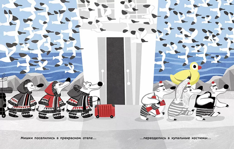 «Мишки на каникулах» — о долгожданном лете и каникулах! Мишки — как дети, которые хотят получить всё, сразу и много! Если мороженое, то до ангины, если фрукты, то до расстройства желудка, если аттракционы, то до синяков! А как же иначе на каникулах?! Зато впечатления и воспоминания остаются всегда самые-самые хорошие! Стильные и полные интересных деталей иллюстрации полны юмора и скрытых историй и пародий: то тут, то там угадываются традиционные типажи отдыхающих! Ну и конечно, в полных энтузиазма мишках легко узнать себя на море — с обгорелым носом и кучей сувениров!